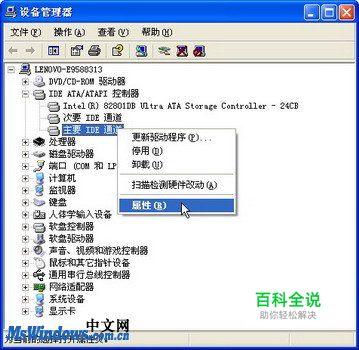第3步,在打开的“设备管理器”窗口中展开“IDE ATA/ATAPI控制器”目录,右键单击“主要IDE通道”选项,选择“属性”命令,如图2010040510所示。 图2010040510 “设备管理器”窗口