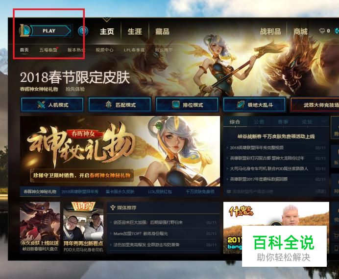 首先,我们打开LOL游戏的客户端主页面,在主页面中点击“PLAY”按钮,开始进入游戏模式选择。