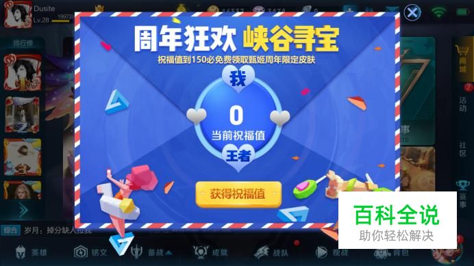 打开“王者荣耀”,系统会自动弹出“峡谷寻宝”活动,然后点击“获取祝福值”。