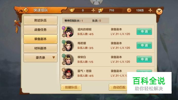 进入装备副本界面,每日可参加挑战3次,并且还能购买一次额外的,挑战副本需要进行组队,点击“快速组队”