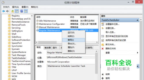 3. 拖“死”系统的自动维护 如果你的电脑配置不高,Windows 8系统自动维护功能让你的系统运行变得缓慢,甚至会有死机、无响应的假象产生。在这种情况下,不如将其关闭,转而借助第三方工具(如360安全卫士组件中的系统维护模块)来定时维护系统。 在“操作中心”关闭了“自动维护”选项没有从根本上解决问题,那只是一个消息提示选项。要彻底关闭这个功能,需要到计划任务中去实现。 通过“控制面板→管理工具→任务计划程序”,找到“\Microsoft\Windows\TaskScheduler”,禁用“Idle Maintenance”和“Regular Maintenance”两项任务即可禁用自动维护