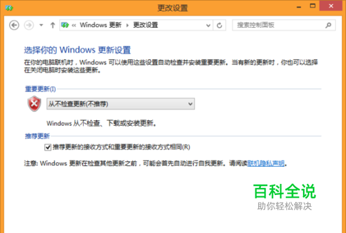 2. 已有托管者的自动更新 现在有些第三方系统工具,也可以管理Windows 8系统自动更新,如360安全卫士的系统更新会根据情况提示哪些补丁一定要更新,哪些补丁可选择更新,哪些补丁更新后可能会副作用等,比较体贴。因此,如果选择第三方系统更新工具,系统自带的更新提示和更新就成了累赘。 按动Win+X快捷键组合,选择“控制面板全→系统和安全→Windows更新→启用或关闭自动更新”,选择“从不检查更新”,点击“确定”按钮关闭自动更新(如图3)。然后点击任务栏操作中心小旗帜图标,选择“更改操作中心设置”打开操作中心,去掉对“Windows更新”一项的选择,单击“确定”按钮。