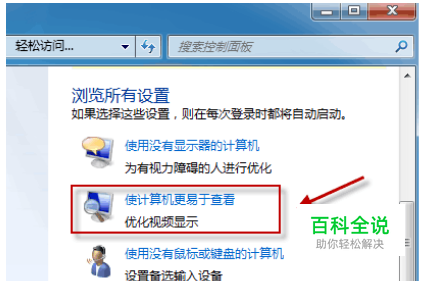 在开始搜索框中输入轻松访问中心,回车。拉动滑块到“浏览所有设置”。单击“使计算机更易于查看”