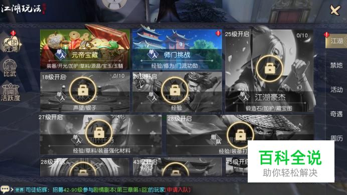 进入活动界面,在“江湖”中选择“师门挑战”,通过获得我们可获得经验修为和功勋。