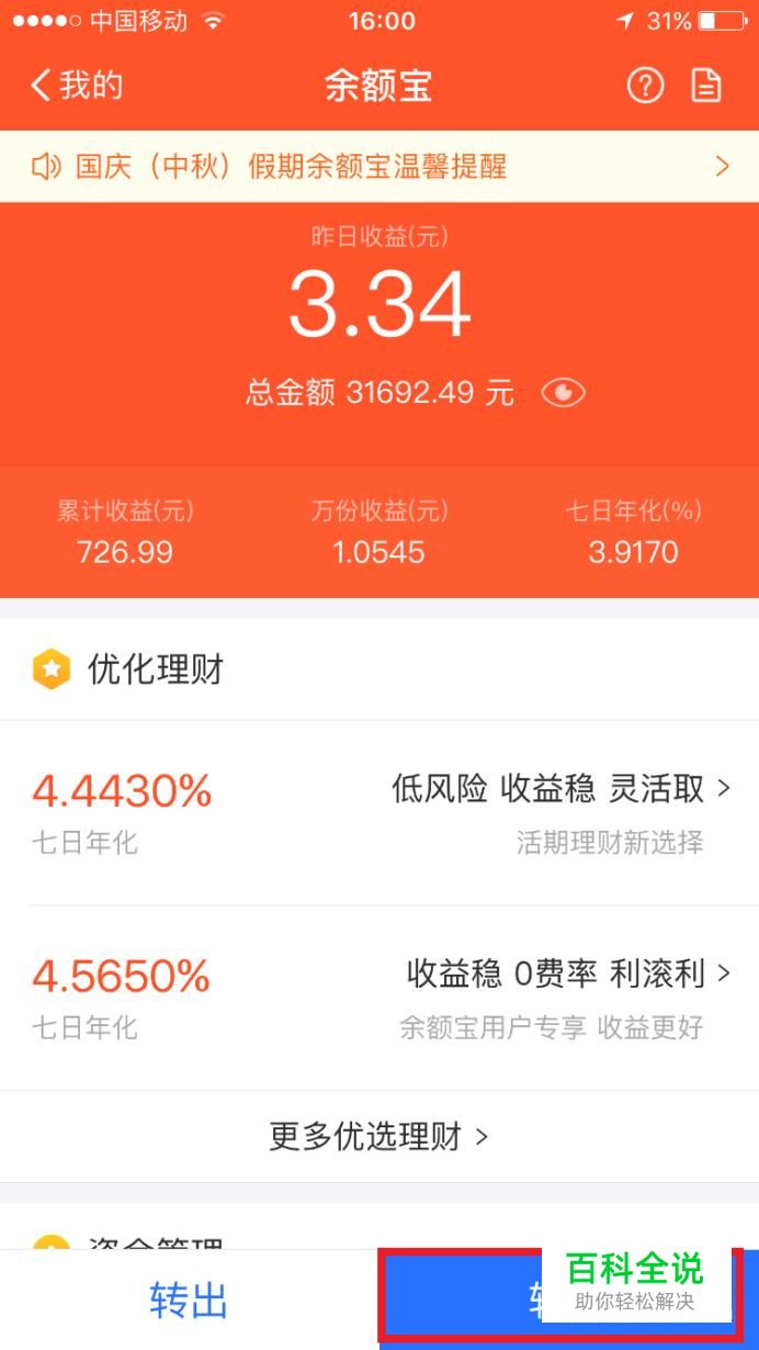 回到余额宝页面,我们查看金额,金额增加,操作成功。