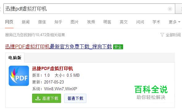先在自己的常用的搜狗浏览器中搜索关键词“迅捷pdf虚拟打印机”,然后把它下载下来。