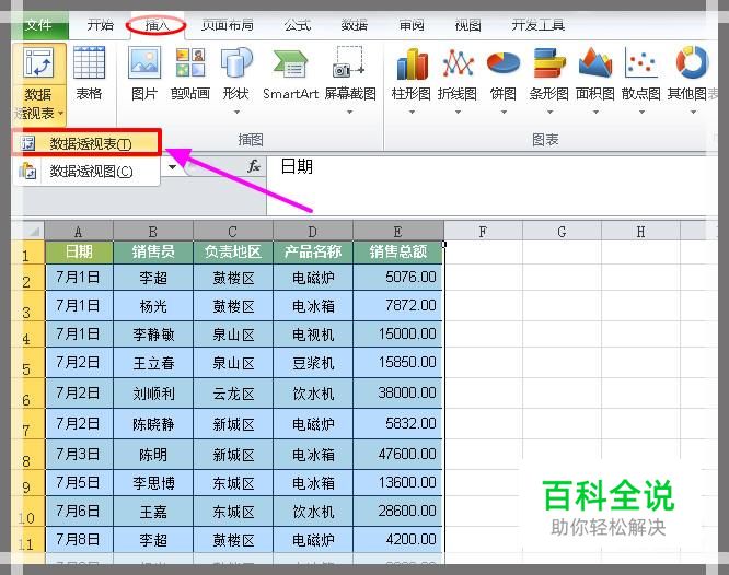 新建空白数据透视表: 打开例表选中目标区域,点击菜单栏"插入"按钮,点开"数据透视表"的下拉三角按钮选择"数据透视表" 。
