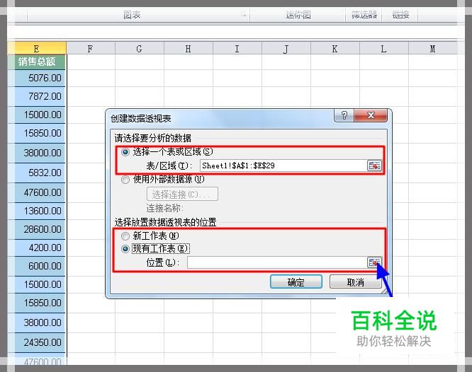 单击一下要创建数据透视表单元格区域的初始位置,该单元格路径会出现在"创建数据透视表"文本框。位置选择完毕后,点拾取器返回到上一步的"创建数据透视表"对话框。