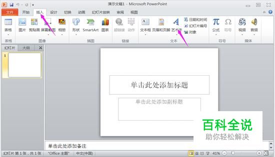 打开PowerPoint2010,点击导航栏中的“插入”,再点击“文本”中的“艺术字”