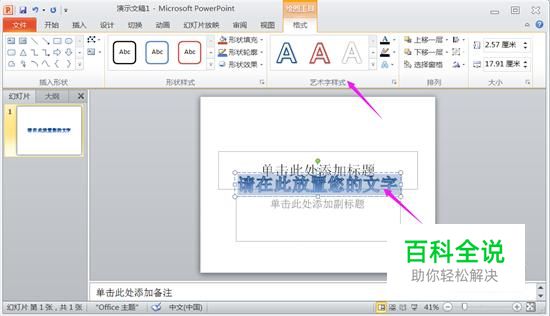 单击输入好的艺术字,导航栏上方会出现“绘图工具——格式”的字样,点击“格式”