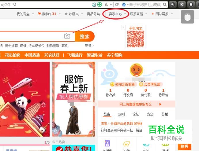 打开淘宝首页登录,在右上方找到卖家中心。