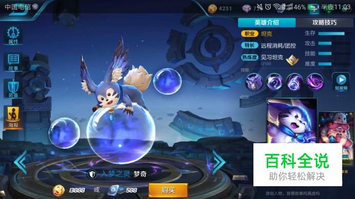 梦奇是一款坦克,特长是远程消耗和团控,生存指数相当高!他的攻击值,技能值都在中间水平,总的看来操作难度一般。技能为梦境萦绕,梦境挥洒,梦境旋涡。