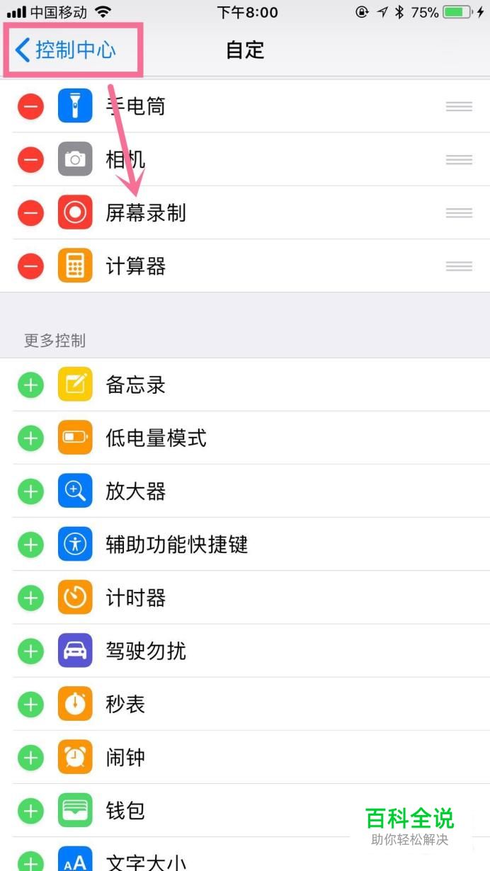 首先在我们的手机设置上把屏幕录制按钮添加到控制中心,如下图所示。