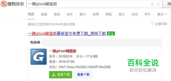首先我们打开搜狗浏览器,搜索 一键ghost硬盘版 ,并且下载
