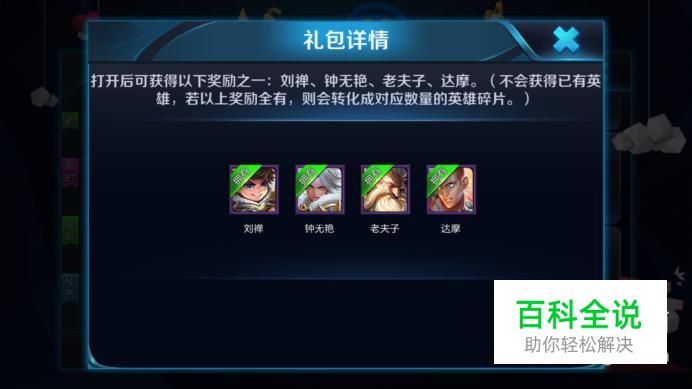 你也可以用50个“感恩节美食”兑换“冬”,打开可获得刘婵、钟无艳、老夫子和达摩四个英雄中的一个。如果这些英雄你都收集到了,建议兑换其他礼包。