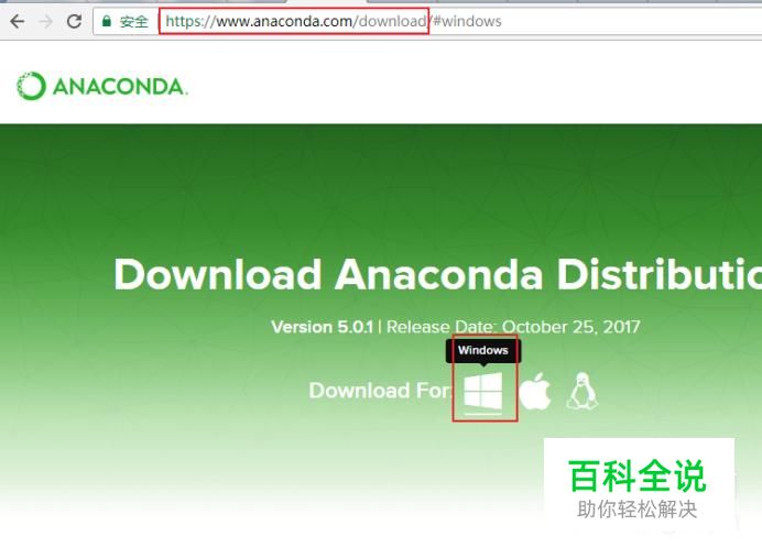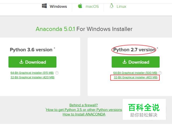 首先,在官网https://www.anaconda.com/download/下载Anaconda。 先选择Windows系统,然后根据需要选择安装Python 3.6版或Python 2.7版,这里选择Python 2.7版中的 32-bit Graphical Installer。