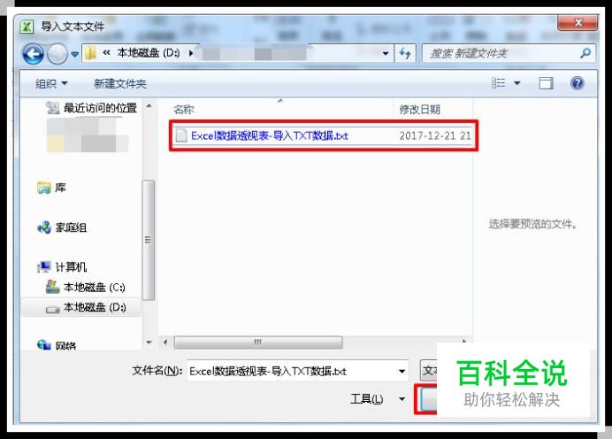 弹出"导入文本文件"对话框后,打开相应的路径,单击TXT文本文件,然后点击"导入"按钮(或者直接双击TXT文本文件)。