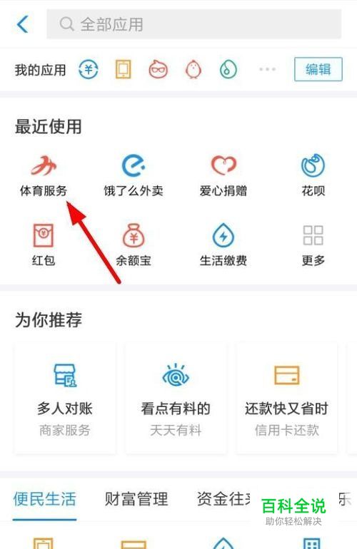 首先我们登录支付宝之后,在支付宝的应用里找到体育服务应用。