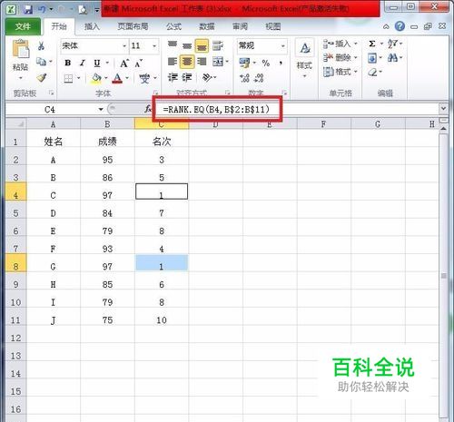 我们以几个简单的数据作为示例。我们一般用的名次计算公式是RANK.EQ公式,=RANK.EQ(B4,B$2:B$11)。
