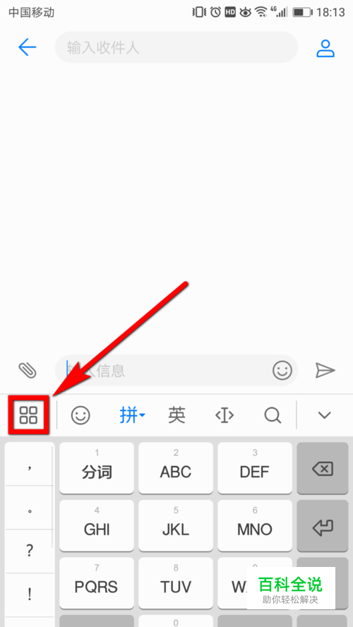 首先进入到手机的输入页面,比如可以通过新建短信,或者是进入到微信的输入页面,就会弹出这个输入键盘。看到输入键盘以后,点击键盘左上角的图标,如图所示。