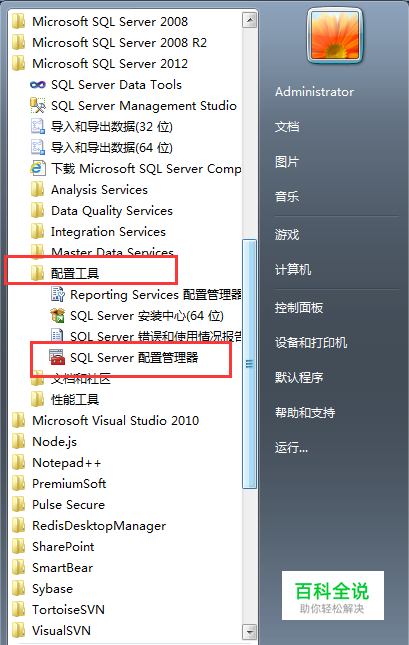 点击【配置工具】下的【Sql Server 配置管理器】,如下图中标红的文件夹。