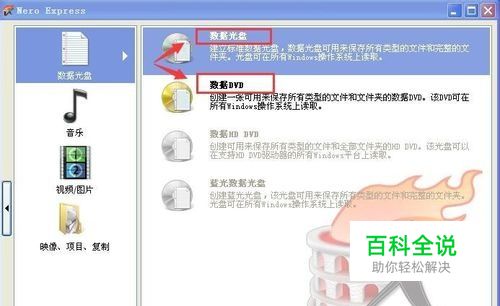 打开之后,会有数据光盘、音乐、视频/图片、映像、项目、复制,根据你需要放入的类型来选择是数据还是音乐还是视频等,假设我们就需要将一个excel表放入光盘中,那么我们就选择数据光盘,数据光盘又包含数据光盘和数据DVD