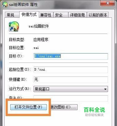 如果sai在运行中的先把它关掉,然后找到sai快捷方式,点击右键-属性-打开文件位置