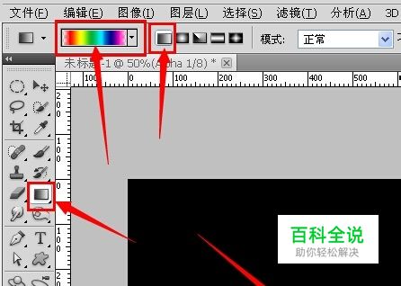 按住ctrl+点选刚才新建的通道缩略图,选中文字。然后选渐变工具,选择彩虹渐变,线性渐变,拉出渐变,好了,得到下图的效果。