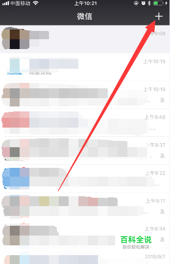 然后,打开手机微信,进入手机微信的主页面,并且点击手机微信主页面右上角的“+”。
