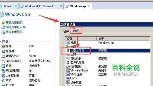 在对于的虚拟主机设置窗口下 依次点击【选项】--->【共享文件夹】,然后我们看到虚拟主机设置窗口的右侧。