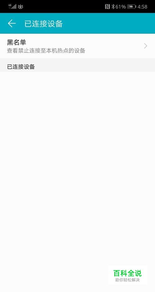 在这里就可以查看禁止连接至本机热点的设备了,因为我没有设置黑名单,所以里面为空,如果设置有名名单的,就能查询到禁止连接至本机热点的设备名称了。