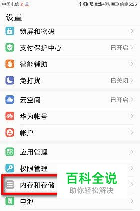 在“设置”页面中,打开“内存与存储”