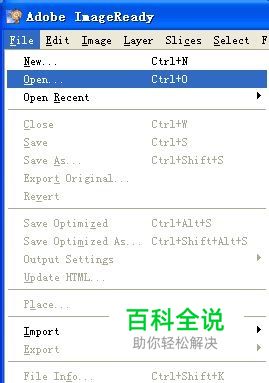 打开Adobe ImageReady软件,鼠标点击File菜单中的Open子菜单,如下图所示。