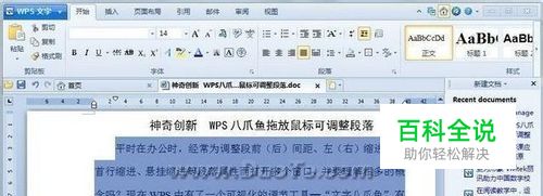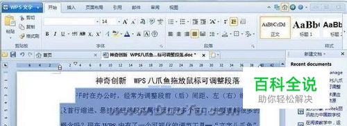 三、在多个段落上使用“文字八爪鱼”功能 如此实用的功能,很多人一定希望在调整多个段落的时候也能用上,这样在整理从网上粘贴回来的杂乱文字就更能发挥这个强劲功能了。如果我们需要调整多个段落的属性时,只要选中所有需要调整的段落,就会在选中部分最后一行文字的左侧显示“文字八爪鱼”按钮,单击它,会在最后一个段落上显示淡蓝色边框。之后,就像调整单个段落一样,只是所作调整将会应用于所有选中的段落(如图4)。