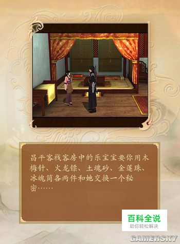 Ⅰ.江都 进入江都城后与昌平客栈二层客房丙的乐宝宝对话,她会要求带给她木梅针、火龙镖、土魂砂、金莲珠、冰魄筒各两件 注:①火龙镖可在秦始皇陵开宝箱得到 ②青龙镇有一宝箱内有木梅针×1、金莲珠×1、冰魄筒×1 ③中皇山内有一宝箱有冰魄筒×3 ④完成侠义榜 古刹高僧•一 任务可得金莲珠×1 ⑤这个任务需要的材料都是可以在江都城所卖物品更新后(青玉坛迷宫之后)买到