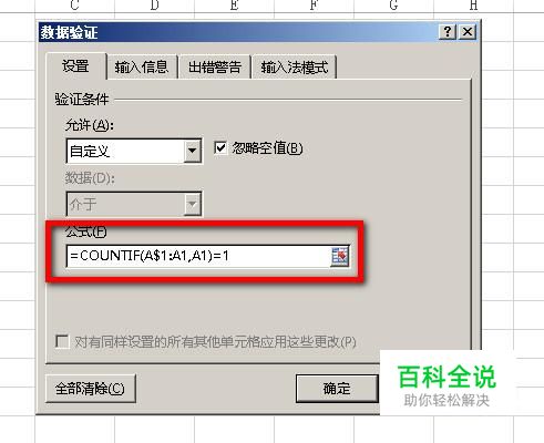 即时,在下面显示出一个输入框, 在此框内输入公式:=COUNTIF(A$1:A1,A1)=1 公式解释:公式中COUNTIF函数,我们可以理解按条件统计单元格个数的函数;而括号内的左边这一段是要统计的单元条区域,注意的是A1要加上绝对引用符号;括号内右边的A1单元格即是条件。那么,整个公式在这数据验证中的意思是当以A1的数值为条件在指定的数据区域内统计出的单元格个数等于1时,允许输入数值;如果统计出的单元格个数不等于1时那么不能输入数值。