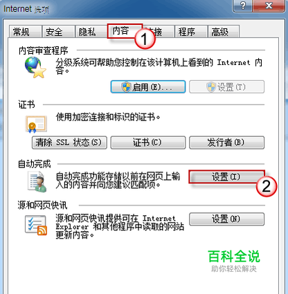 在 Internt 选项的“ 内容”选项卡中,点击自动完成的“ 设置”按钮