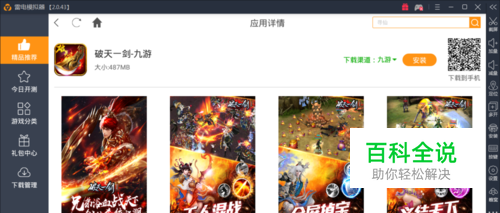 从网上下载一款安卓模拟器并安装。这里我以雷电模拟器为例子。 在游戏中心找到《破天一剑》并安装。