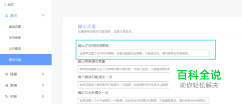 什么叫提示文案 就是当设置了填写限制的表单,用户超过了限制后再次提交不成功,反馈给用户的提示语。系统会提供一些默认文案供选择,但是也可以用户自行设置