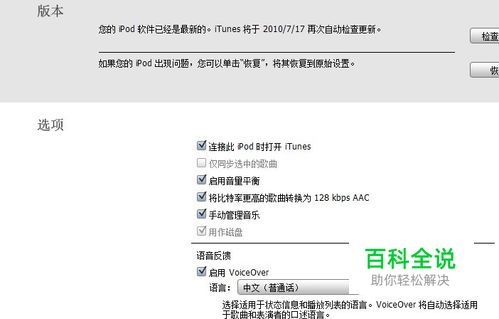 VoiceOver kit组件安装方法: 1、voiceover kit组件默认是没有安装的,需要额外下载。当然下载全部是在itunes中进行,所以很简单。 2、安装好后,打开iTunes,将你的ipod插到电脑上 ,语言反馈,在启用Voice Over功能的框框里打钩(此时语言栏里只显示英语,下拉菜单的小三角成灰色状),打钩之后过一会,会有一个提示,让你安装Voicerover kit,将它安装好后,语言栏里的灰色三角下拉菜单会变黑色,选择 中文(普通话)即可。(这样开启了shuffle的voiceover kit组件)