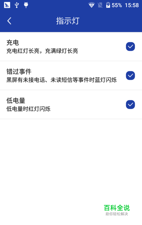 当打开“错过事件”指示灯时:黑屏有未接电话、未读短信等事件时蓝灯闪烁。我们则可以在手机黑屏时也能方便辨别当前错过的事件。