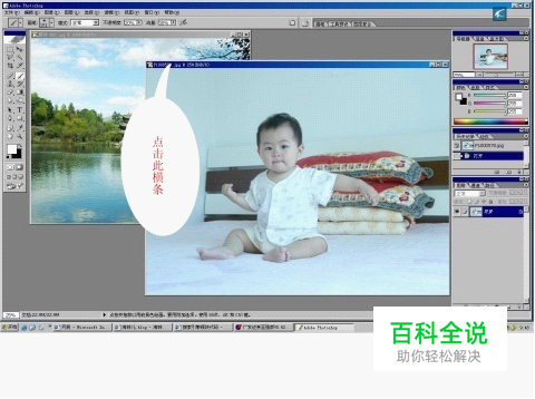 选择“移动工具”=》在人物图片上按住左键不放,然后拖动图片,当移动工具显现在风景图片中时松开左键,人物图片就移到风景图片中了,下图就是人物图片移动到了风景图片中,不过人物图片比风景图片大,盖着了风景图片