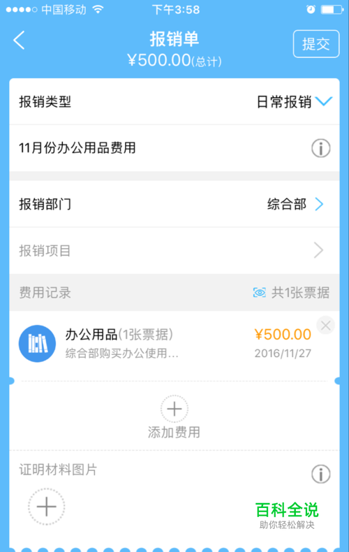 填写报销单的相关信息如:报销事由、部门归属、项目归属等信息后,点击右上角的【提交】按钮即可成功提交报销单。如图: