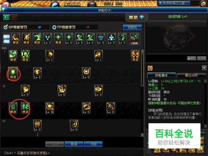 然后我们打开技能栏,先将最上方的通用技能受身蹲伏和物理暴击加满。然后我们选择将天使光翼,天使降临,自动防御加满,神光冲击先学一级最后将剩下的SP点再加给它。