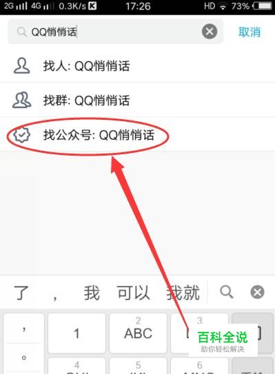 进入之后在搜索框搜索“QQ悄悄话”,点击“找公众号:QQ悄悄话”,进入下一界面。