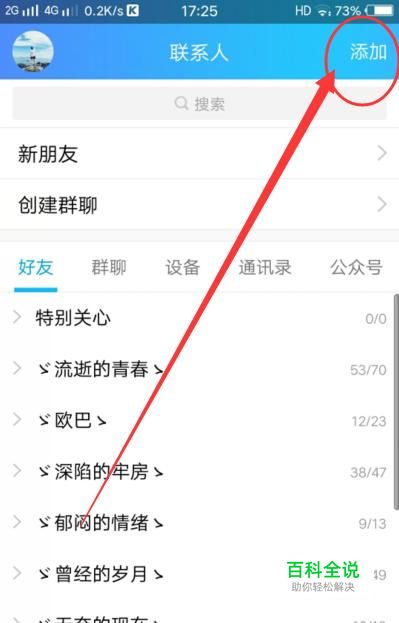 打开手机QQ,在联系人页面点击右上角的“添加”,进入下一界面。