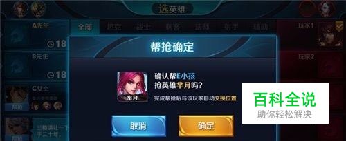 当1、2楼处于选择英雄的环节时,3、4、5楼的队友可以发出帮抢的信号。此时1、2楼的界面中,需要帮抢英雄的玩家头像将会显示为需要帮抢的英雄头像,并且同时出现“帮抢按钮”,如图所示: