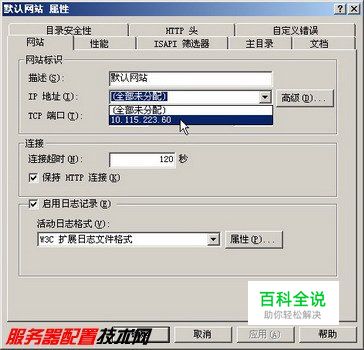 第2步,打开“默认网站 属性”对话框,在“网站”选项卡中单击“IP地址”右侧的下拉三角按钮,并选中该站点要绑定的IP地址,如图2008111425所示。 图2008111425 “网站”选项卡