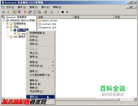 第1步,在开始菜单中依次单击“管理工具”→“Internet信息服务(IIS)管理器”菜单项,打开“Internet信息服务(IIS)管理器”窗口。在左窗格中展开“网站”目录,右键单击“默认网站”选项,在弹出的快捷菜单中选择“属性”命令,如图2008111424所示。 图2008111424 “Internet信息服务(IIS)管理器”窗口