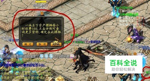 2、找点,这个最关键,一般情况都是在要卡的摊位左上方找点,大家可以看见圈红线的地方,看到鼠标点到51号摊位旗了吧,为什么要找点呢?因为如果你站在摊位旁边有人在摆摊,你用鼠标根本就点不到摊位旗,只有看不见摆摊人物的时候才可以点到摊位旗,鼠标点到摊位后,就会出现如图所示,一朵名下资产摆摊每小时收费500,点击“确定”